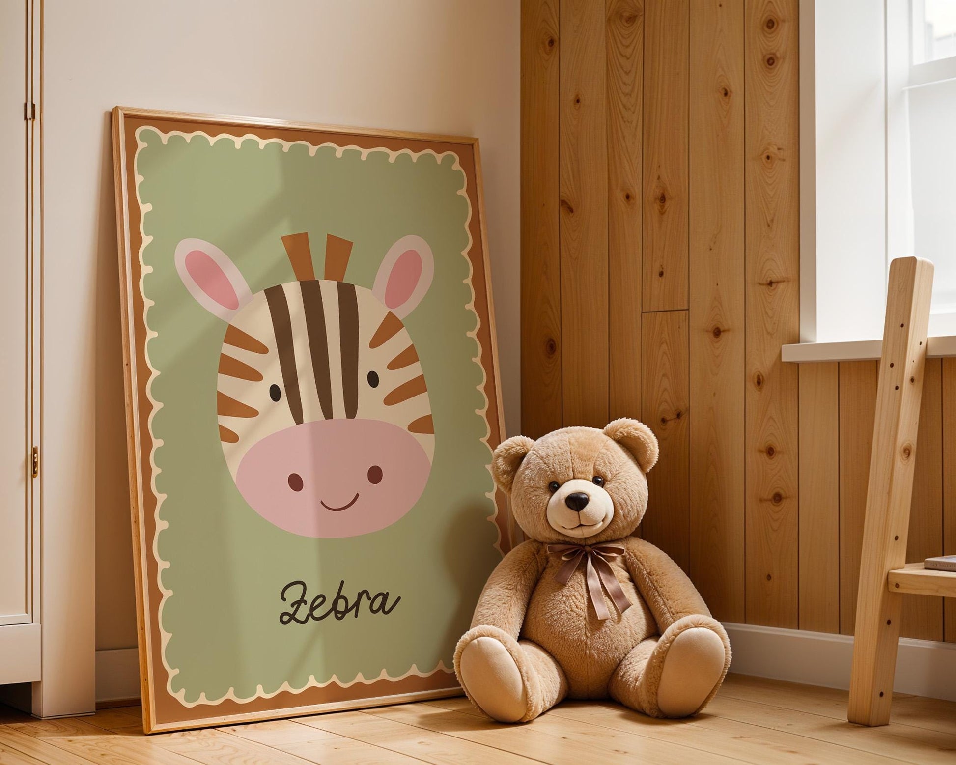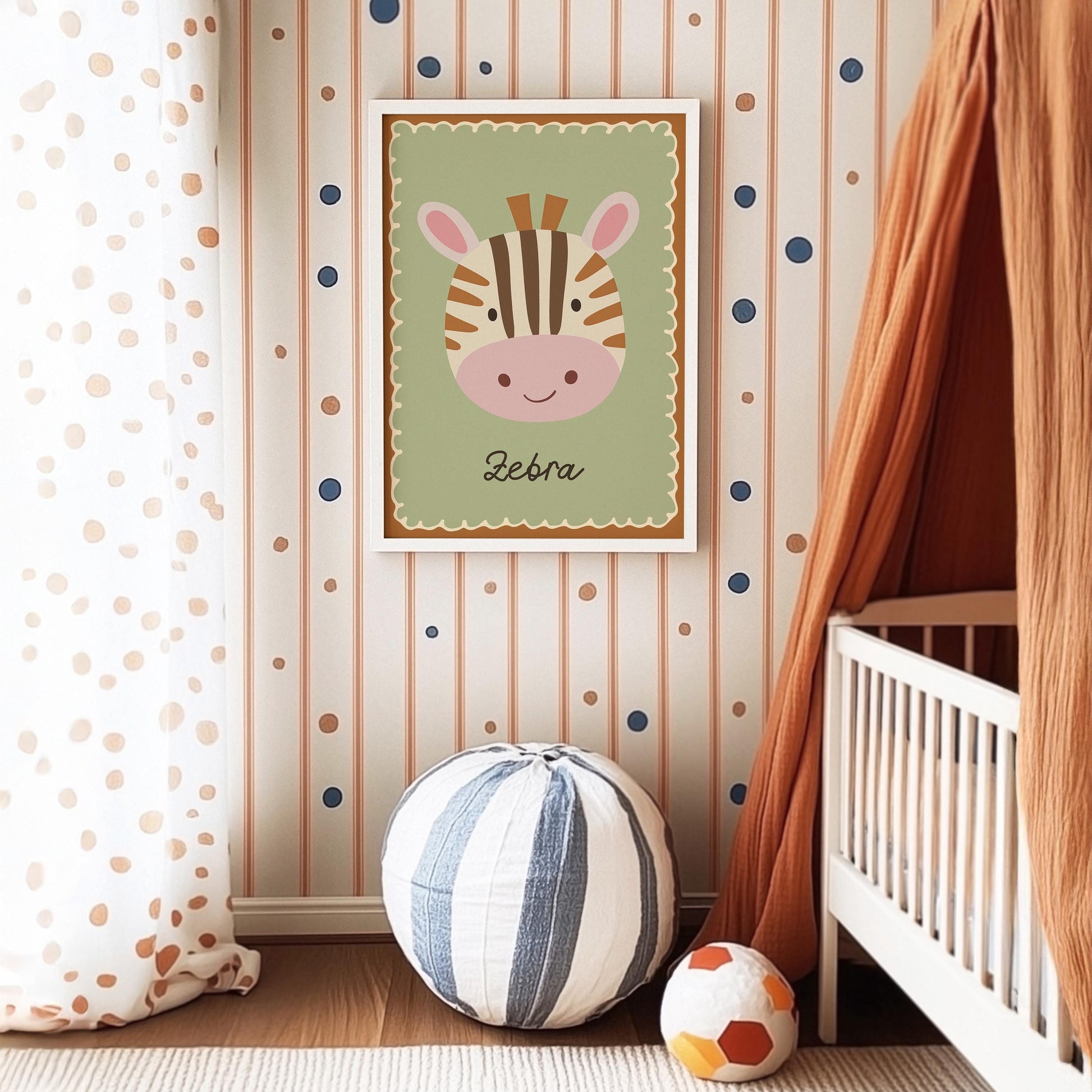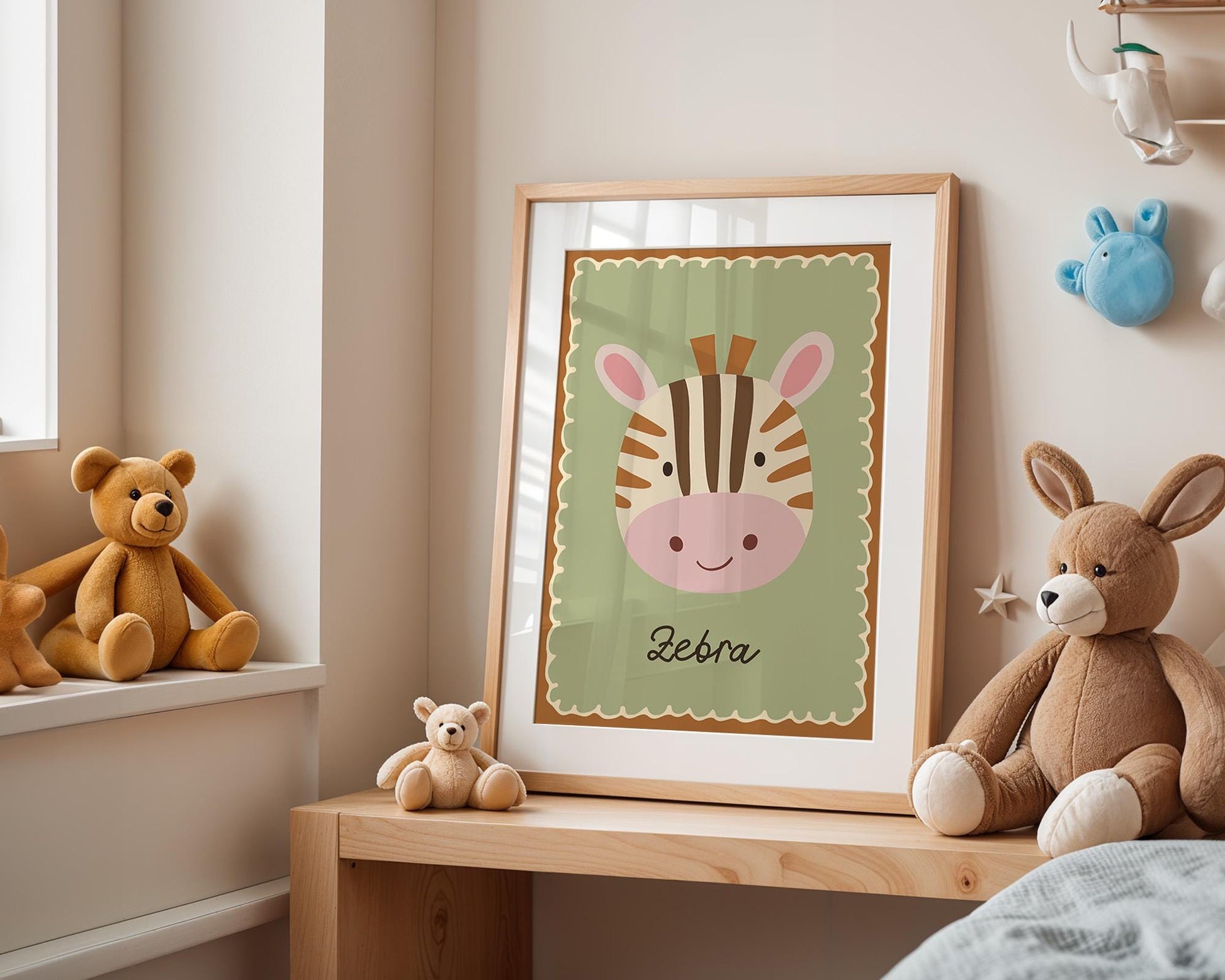 Poster Kinderzimmer Zebra ยท Niedliches Tiermotiv auf Grรผn ยท Safari Deko fรผr Babyzimmer ยท Liebevoll illustriert ยท Dekoprint ohne Rahmen