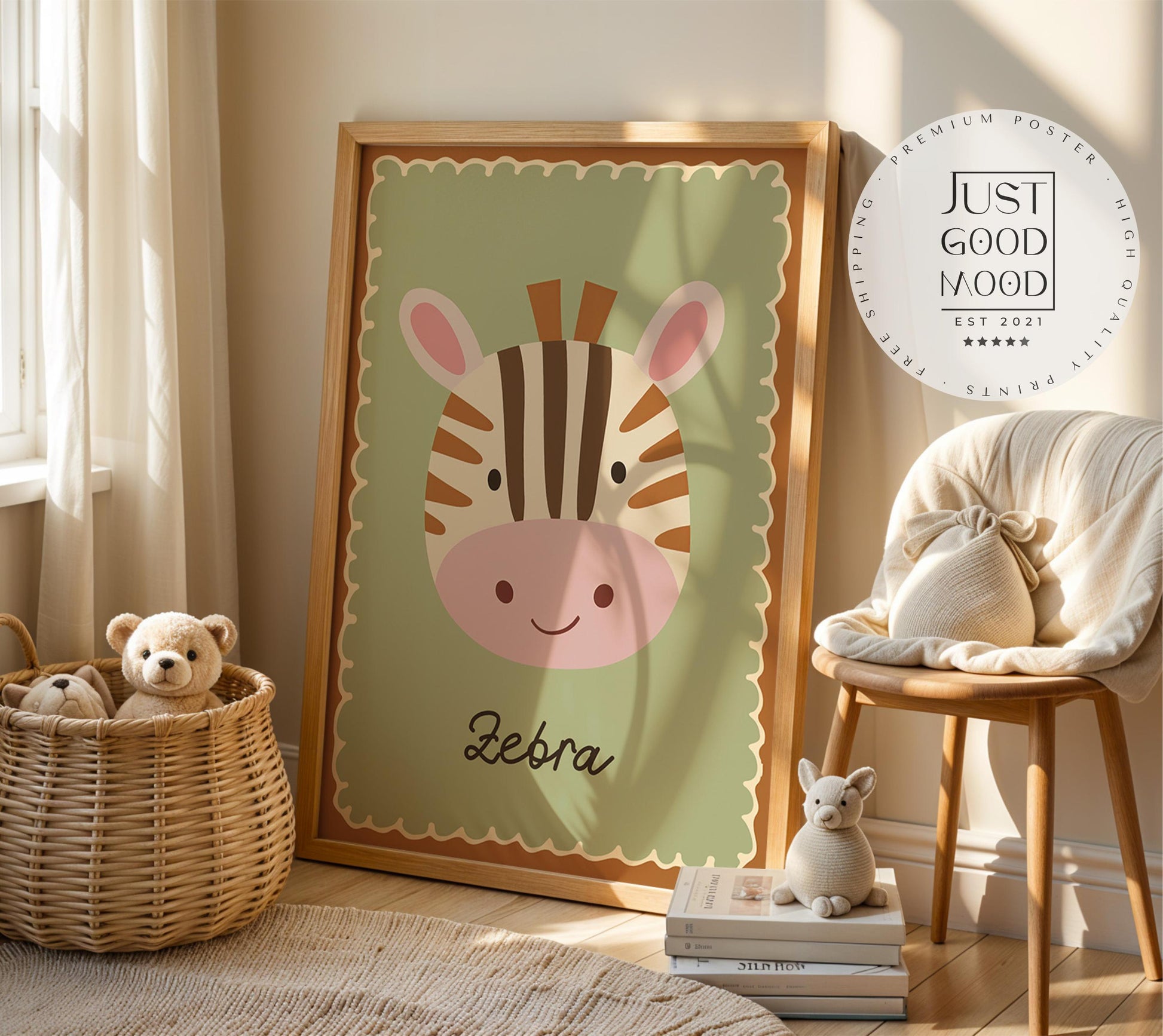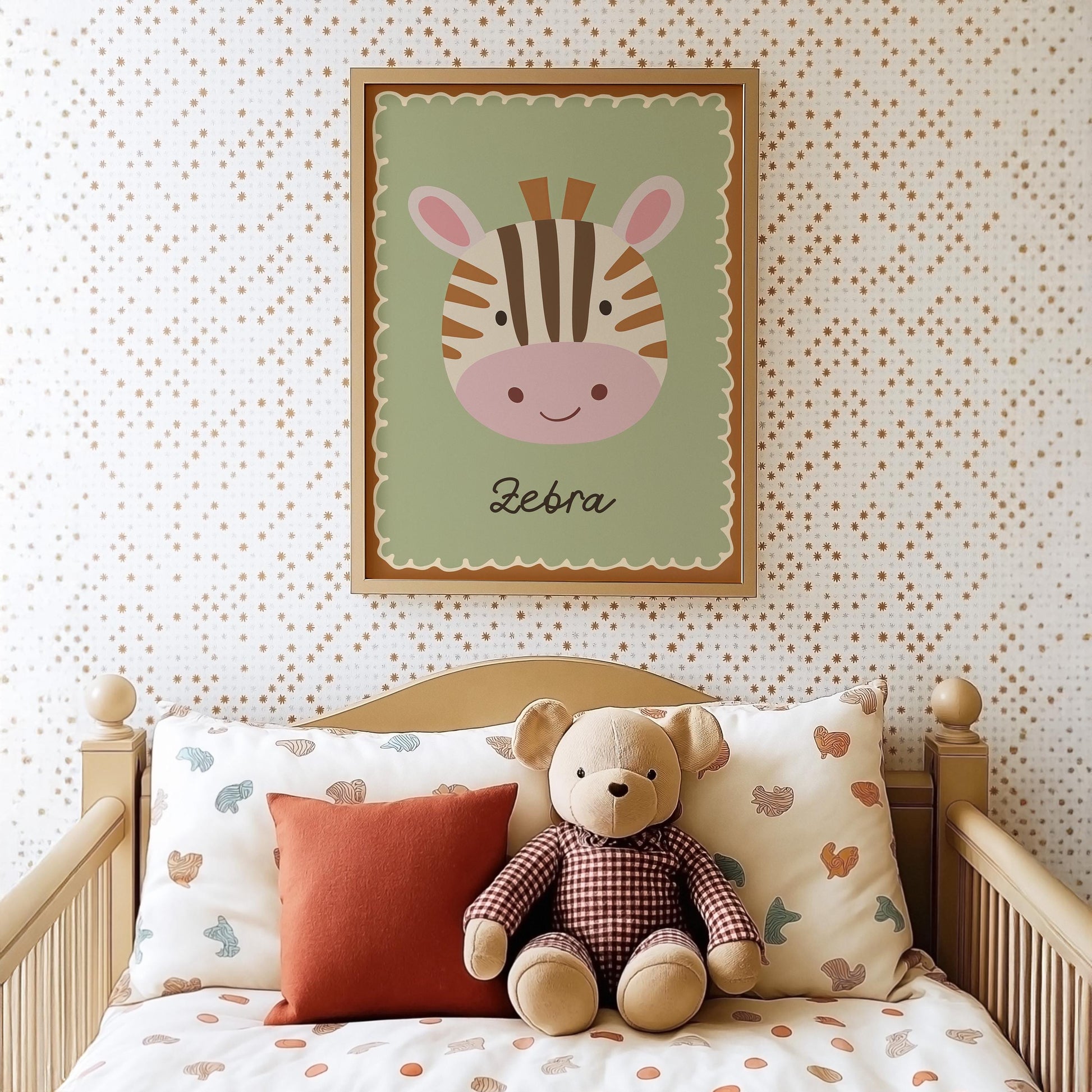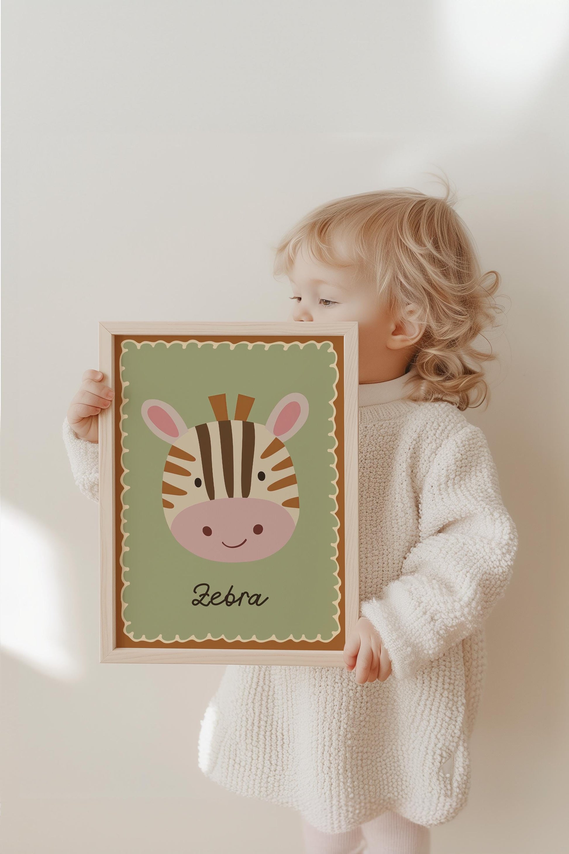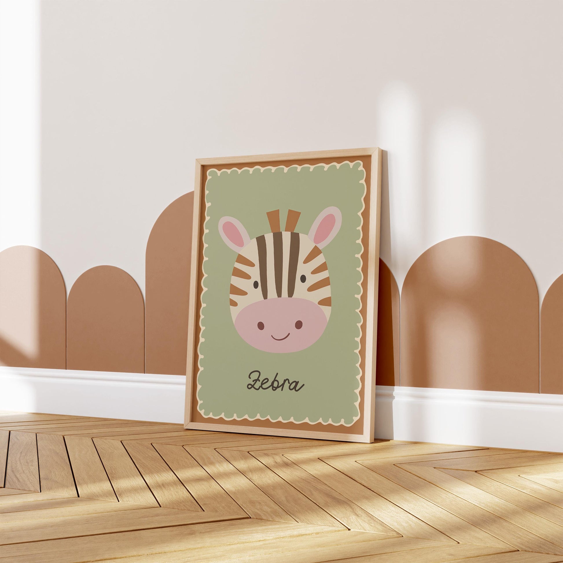 Poster Kinderzimmer Zebra ยท Niedliches Tiermotiv auf Grรผn ยท Safari Deko fรผr Babyzimmer ยท Liebevoll illustriert ยท Dekoprint ohne Rahmen