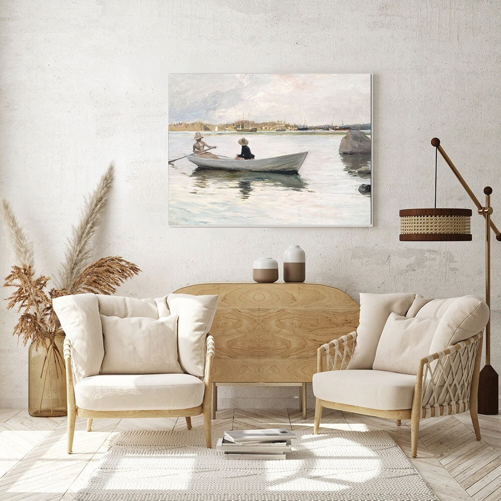 Erleben Sie den Charme des Vintage-Stils mit unserem Poster "Vintage Blumen und Sightseeing mit dem Boot". Dieses dekorative Kunstwerk bringt eine nostalgische Atmosphäre in jeden Raum und eignet sich perfekt als Blickfang in Ihrem Wohnzimmer, Schlafzimmer oder Büro.