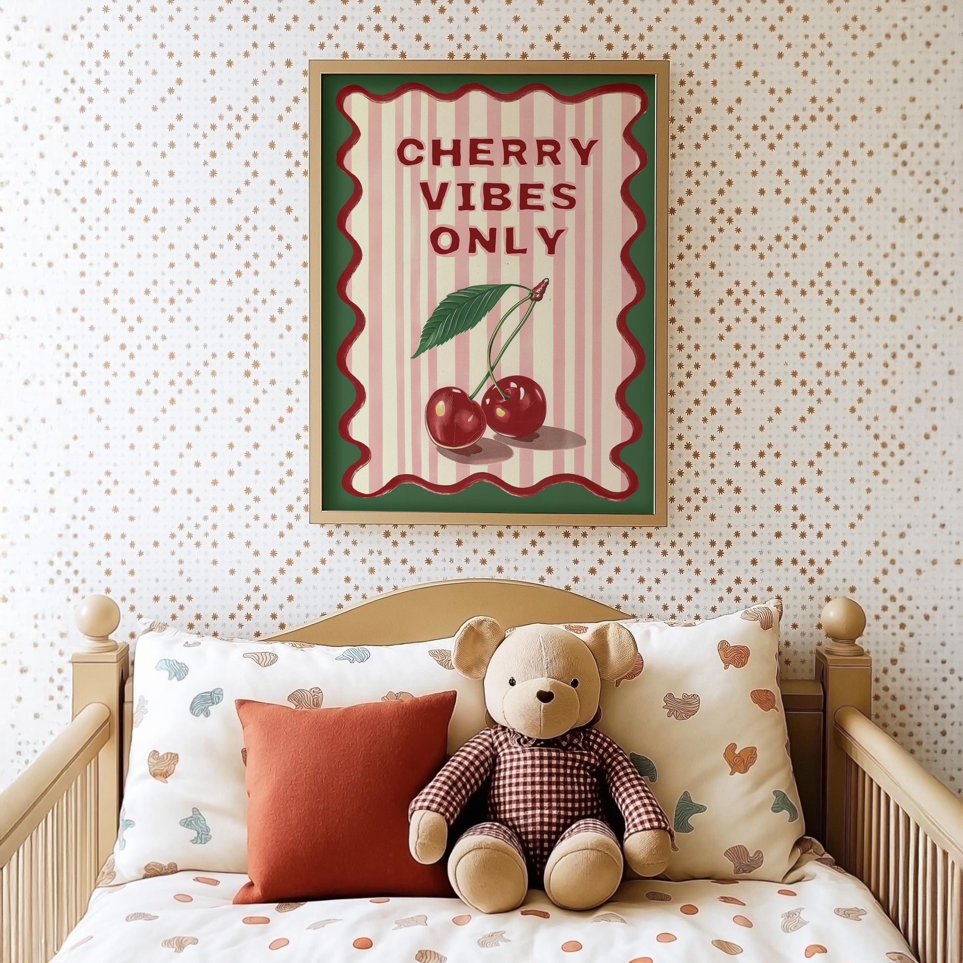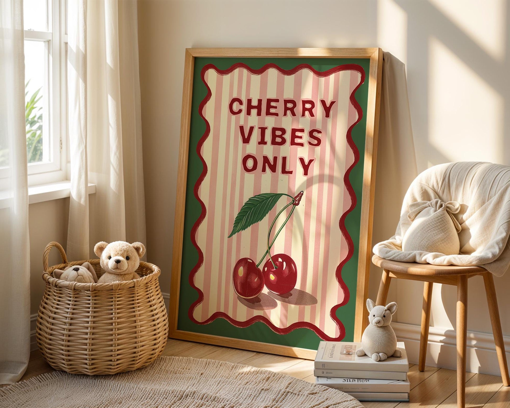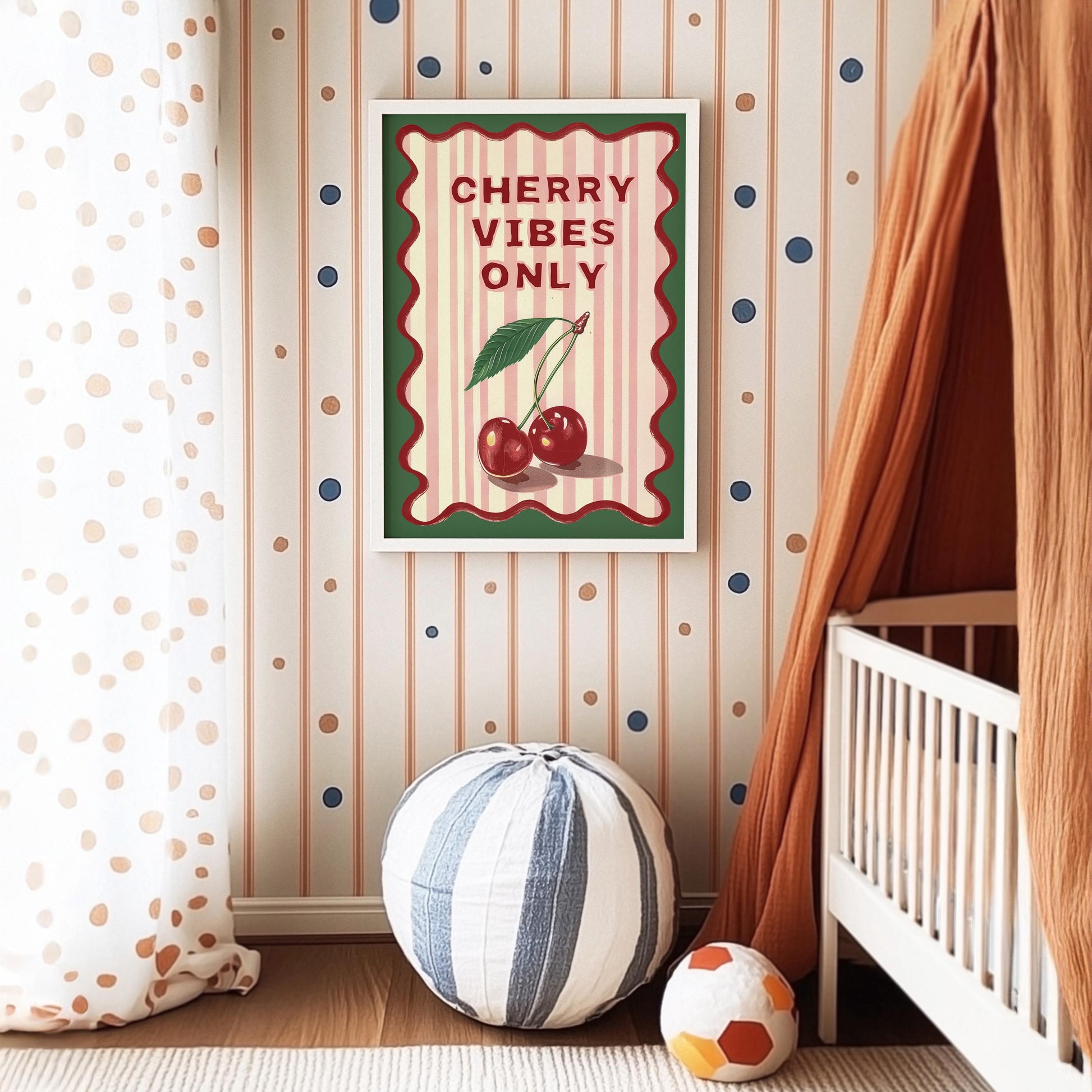 Poster Kinderzimmer Kirschen ยท Cherry Vibes Only ยท Fruchtige Wanddeko im Retro Look ยท Lustiges Spruchposter ยท Deko Print Ohne Rahmen